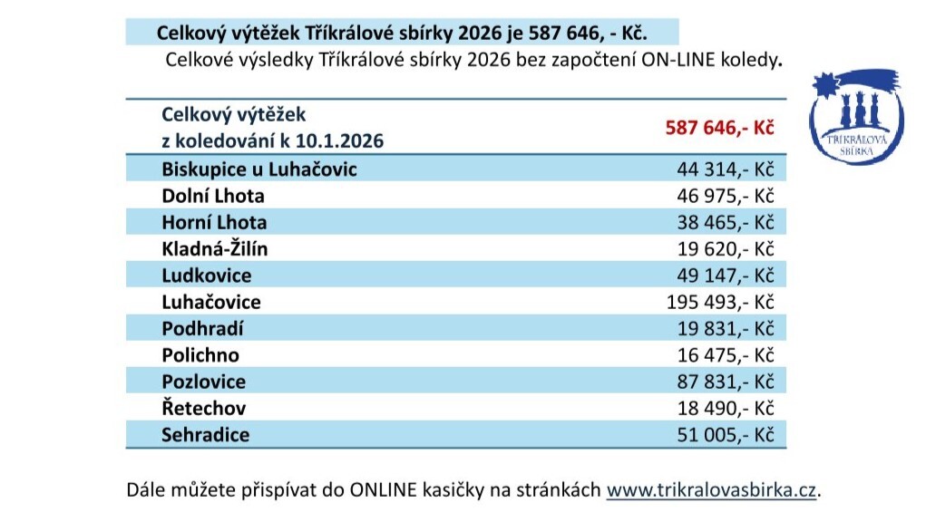Letošní Tříkrálová sbírka proběhla po dlouhých letech opět na sněhu. V sobotu 10. ledna 2026 se koledování uskutečnilo za krásného mrazivého počasí, kdy přes noc napadla sněhová nadílka připomínající Ladovu zimu. Děkujeme všem skupinkám tříkrálových koledníků, které sníh neodradil, a po požehnání vyrazily do ulic v jedenácti obcích v územní působnosti Charity Luhačovice. V Luhačovicích byly až na pár výjimek všechny skupinky se třemi králi, některé měly dokonce čtyři. Celkem se do koledování zapojilo 60 skupinek. Děkujeme za milé přijetí – řada z nich si vykoledovala opravdu velkou sladkou koledu. Přestože se někde dveře neotevřely, jinde lidé vybíhali za našimi koledníky i bosí, jen v trenýrkách :).